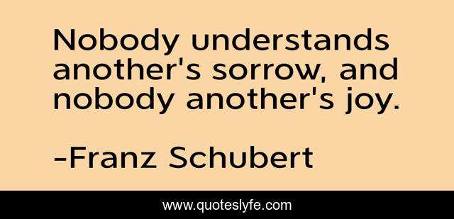 This page presents the quote "Nobody understands another's sorrow, and nobody another's joy.". Author of this quote is Franz Schubert. This quote is about joy, sorrow, nobody,.