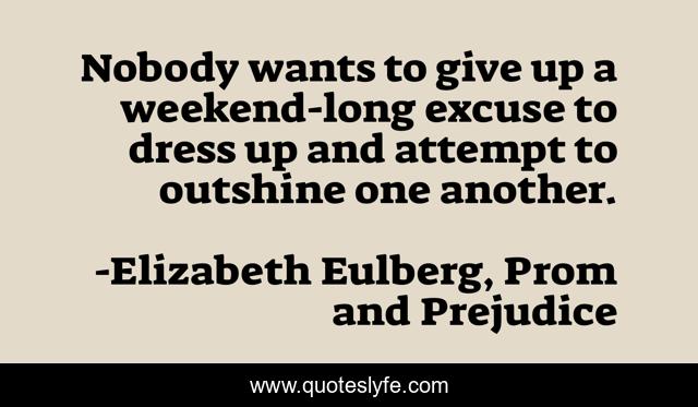This page presents the quote "Nobody wants to give up a weekend-long excuse to dress up and attempt to outshine one another.". Author of this quote is Elizabeth Eulberg, Prom and Prejudice. This quote is about funny, ball, humor, humour, high-school, makeup, arrogance, hair, prom,.