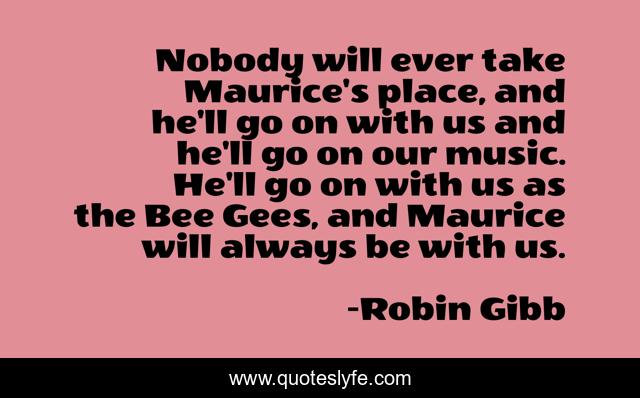 This page presents the quote "Nobody will ever take Maurice's place, and he'll go on with us and he'll go on our music. He'll go on with us as the Bee Gees, and Maurice will always be with us.". Author of this quote is Robin Gibb. This quote is about nobody, place, bee,.