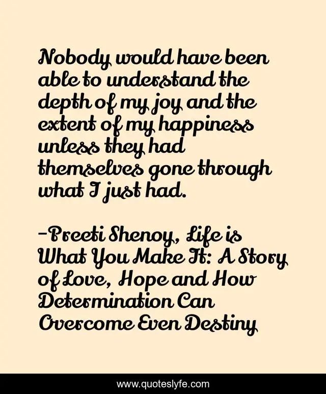 "Preeti Shenoy, Life is What You Make It: A Story of Love, Hope and How Determination Can Overcome Even Destiny Quotes." Quoteslyfe.com, 2025. Fri. 05 Dec. 2025. <https://www.quoteslyfe.com/quote/Nobody-would-have-been-able-to-understand-197203>.