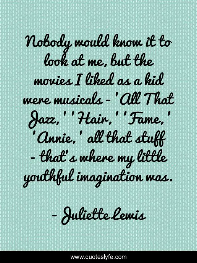 This page presents the quote "Nobody would know it to look at me, but the movies I liked as a kid were musicals - 'All That Jazz, ' 'Hair, ' 'Fame, ' 'Annie, ' all that stuff - that's where my little youthful imagination was.". Author of this quote is Juliette Lewis. This quote is about hair, me, jazz,.