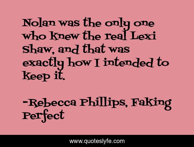 This page presents the quote "Nolan was the only one who knew the real Lexi Shaw, and that was exactly how I intended to keep it.". Author of this quote is Rebecca Phillips, Faking Perfect. This quote is about secrets, ya, faking-perfect,.