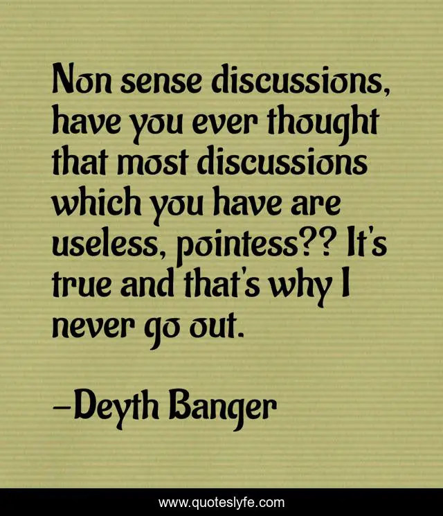 This page presents the quote "Non sense discussions, have you ever thought that most discussions which you have are useless, pointess?? It's true and that's why I never go out.". Author of this quote is Deyth Banger. This quote is about non, thought, have, sense, discussions, ever,.