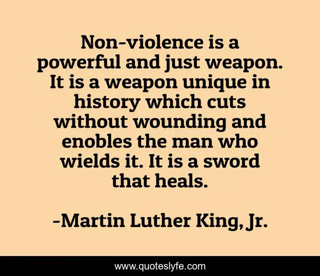 This page presents the quote "Non-violence is a powerful and just weapon. It is a weapon unique in history which cuts without wounding and enobles the man who wields it. It is a sword that heals.". Author of this quote is Martin Luther King, Jr.. .