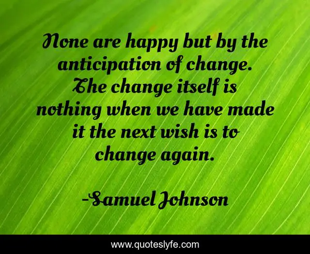 This page presents the quote "None are happy but by the anticipation of change. The change itself is nothing when we have made it the next wish is to change again.". Author of this quote is Samuel Johnson. This quote is about positive, confidence, creating, change,.