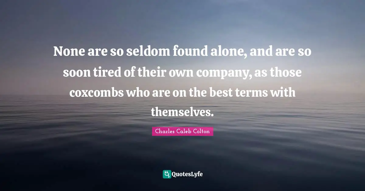 This page presents the quote "None are so seldom found alone, and are so soon tired of their own company, as those coxcombs who are on the best terms with themselves.". Author of this quote is Charles Caleb Colton. This quote is about found, conceit, tired, company,.