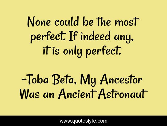 This page presents the quote "None could be the most perfect. If indeed any, it is only perfect.". Author of this quote is Toba Beta, My Ancestor Was an Ancient Astronaut. This quote is about perfect, oneness, incomparable,.
