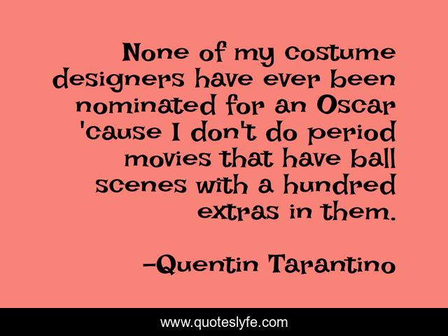 This page presents the quote "None of my costume designers have ever been nominated for an Oscar 'cause I don't do period movies that have ball scenes with a hundred extras in them.". Author of this quote is Quentin Tarantino. This quote is about oscar, ball, costume,.
