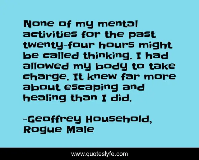 This page presents the quote "None of my mental activities for the past twenty-four hours might be called thinking. I had allowed my body to take charge. It knew far more about escaping and healing than I did.". Author of this quote is Geoffrey Household, Rogue Male. This quote is about instinct, thinking, healing,.