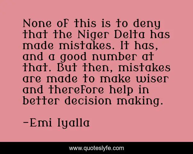 This page presents the quote "None of this is to deny that the Niger Delta has made mistakes. It has, and a good number at that. But then, mistakes are made to make wiser and therefore help in better decision making.". Author of this quote is Emi Iyalla. This quote is about niger-delta, nigeria, mistakes, emi-iyalla,.