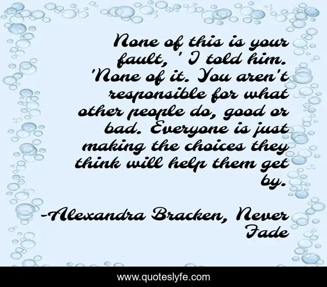 This page presents the quote "None of this is your fault, ' I told him. 'None of it. You aren't responsible for what other people do, good or bad. Everyone is just making the choices they think will help them get by.". Author of this quote is Alexandra Bracken, Never Fade. .