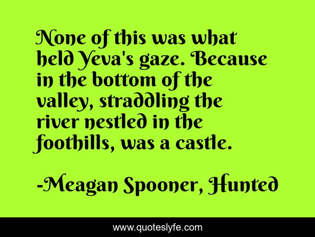 This page presents the quote "None of this was what held Yeva's gaze. Because in the bottom of the valley, straddling the river nestled in the foothills, was a castle.". Author of this quote is Meagan Spooner, Hunted. This quote is about magic, fantasy, ya, yeva, beauty-and-the-beast, castle,.