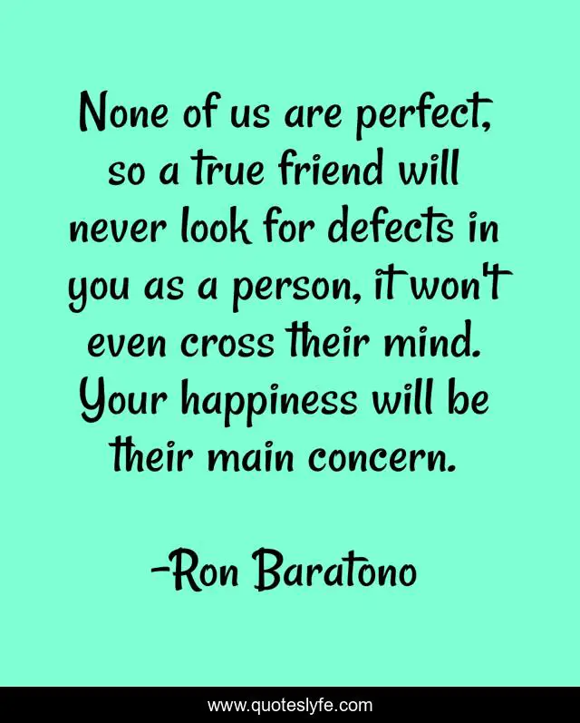 This page presents the quote "None of us are perfect, so a true friend will never look for defects in you as a person, it won't even cross their mind. Your happiness will be their main concern.". Author of this quote is Ron Baratono. This quote is about frindship, person, happiness,.