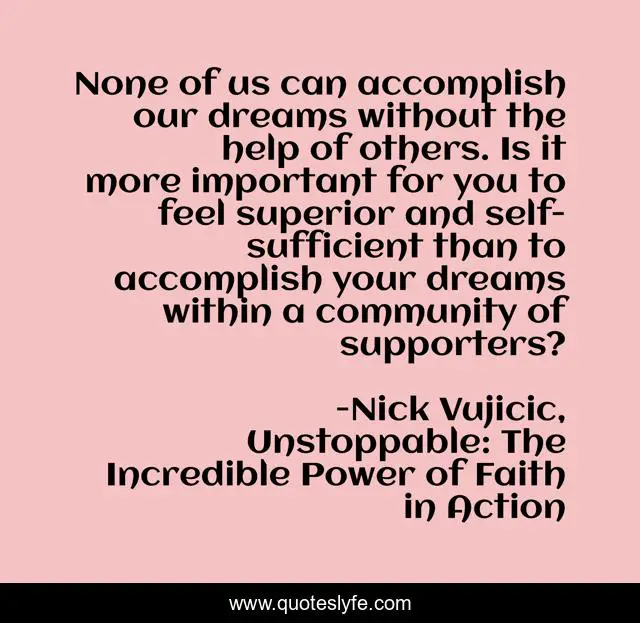 This page presents the quote "None of us can accomplish our dreams without the help of others. Is it more important for you to feel superior and self-sufficient than to accomplish your dreams within a community of supporters?". Author of this quote is Nick Vujicic, Unstoppable: The Incredible Power of Faith in Action. This quote is about community, dreams, success, humility,.