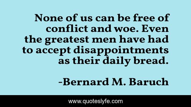 This page presents the quote "None of us can be free of conflict and woe. Even the greatest men have had to accept disappointments as their daily bread.". Author of this quote is Bernard M. Baruch. .