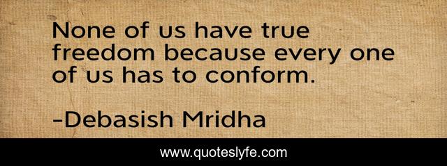 This page presents the quote "None of us have true freedom because every one of us has to conform.". Author of this quote is Debasish Mridha. This quote is about freedom, philosophy, debasish-mridha, true-freedom, quotes, inspirational, enthusiasm, conformity, debasish-mridha-m-d,.