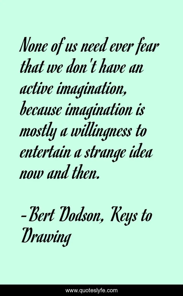 This page presents the quote "None of us need ever fear that we don't have an active imagination, because imagination is mostly a willingness to entertain a strange idea now and then.". Author of this quote is Bert Dodson, Keys to Drawing. This quote is about imagination, ideas,.