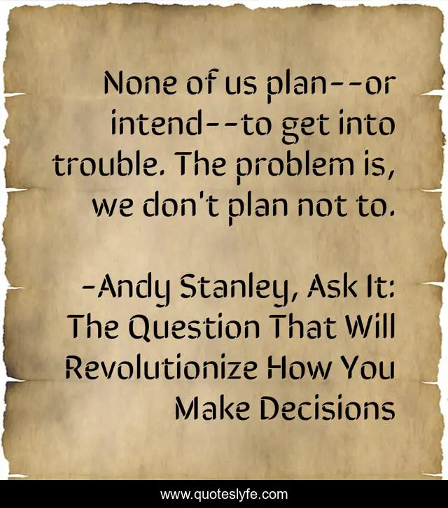 This page presents the quote "None of us plan--or intend--to get into trouble. The problem is, we don't plan not to.". Author of this quote is Andy Stanley, Ask It: The Question That Will Revolutionize How You Make Decisions. This quote is about decision-making, decisions, wisdom,.