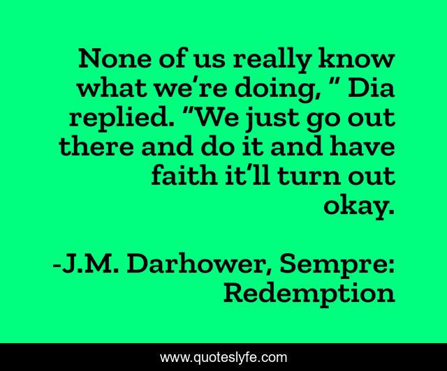 This page presents the quote "None of us really know what we’re doing, ” Dia replied. “We just go out there and do it and have faith it’ll turn out okay.". Author of this quote is J.M. Darhower, Sempre: Redemption. This quote is about faith, destiny,.