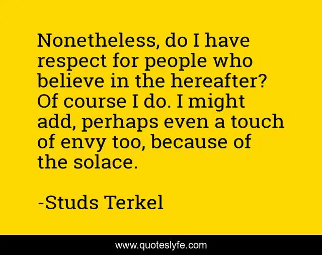This page presents the quote "Nonetheless, do I have respect for people who believe in the hereafter? Of course I do. I might add, perhaps even a touch of envy too, because of the solace.". Author of this quote is Studs Terkel. This quote is about envy, believe, people,.