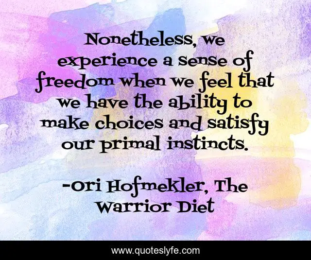 This page presents the quote "Nonetheless, we experience a sense of freedom when we feel that we have the ability to make choices and satisfy our primal instincts.". Author of this quote is Ori Hofmekler, The Warrior Diet. This quote is about food, healthy-living, diet, exercise, nutrition,.