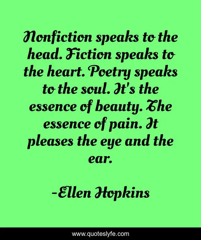This page presents the quote "Nonfiction speaks to the head. Fiction speaks to the heart. Poetry speaks to the soul. It's the essence of beauty. The essence of pain. It pleases the eye and the ear.". Author of this quote is Ellen Hopkins. This quote is about eyes, speaks, head, ellen-hopkins, soul,.