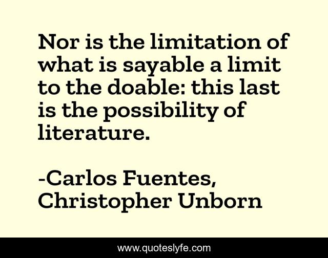 This page presents the quote "Nor is the limitation of what is sayable a limit to the doable: this last is the possibility of literature.". Author of this quote is Carlos Fuentes, Christopher Unborn. This quote is about literature, language,.