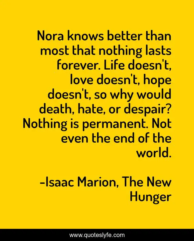 This page presents the quote "Nora knows better than most that nothing lasts forever. Life doesn't, love doesn't, hope doesn't, so why would death, hate, or despair? Nothing is permanent. Not even the end of the world.". Author of this quote is Isaac Marion, The New Hunger. This quote is about life, death, love, despair, hope, dystopia, apocalypse, affection,.
