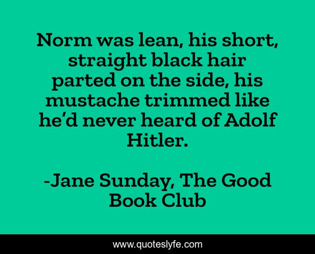 This page presents the quote "Norm was lean, his short, straight black hair parted on the side, his mustache trimmed like he’d never heard of Adolf Hitler.". Author of this quote is Jane Sunday, The Good Book Club. This quote is about detective, mystery, women-sleuths,.