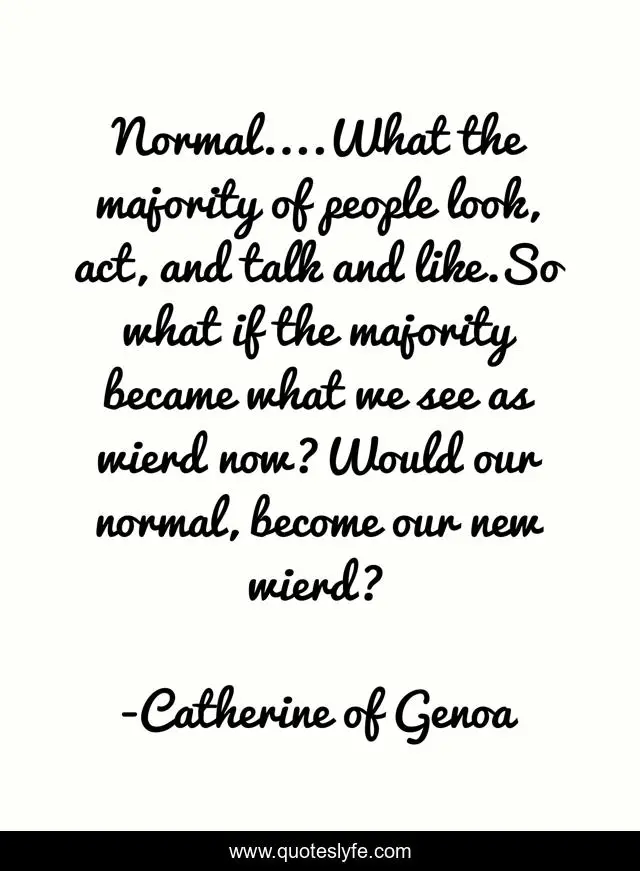 This page presents the quote "Normal....What the majority of people look, act, and talk and like.So what if the majority became what we see as wierd now?Would our normal, become our new wierd?". Author of this quote is Catherine of Genoa. This quote is about humor, strangeness, people, popularity, normality, future, wierdness,.
