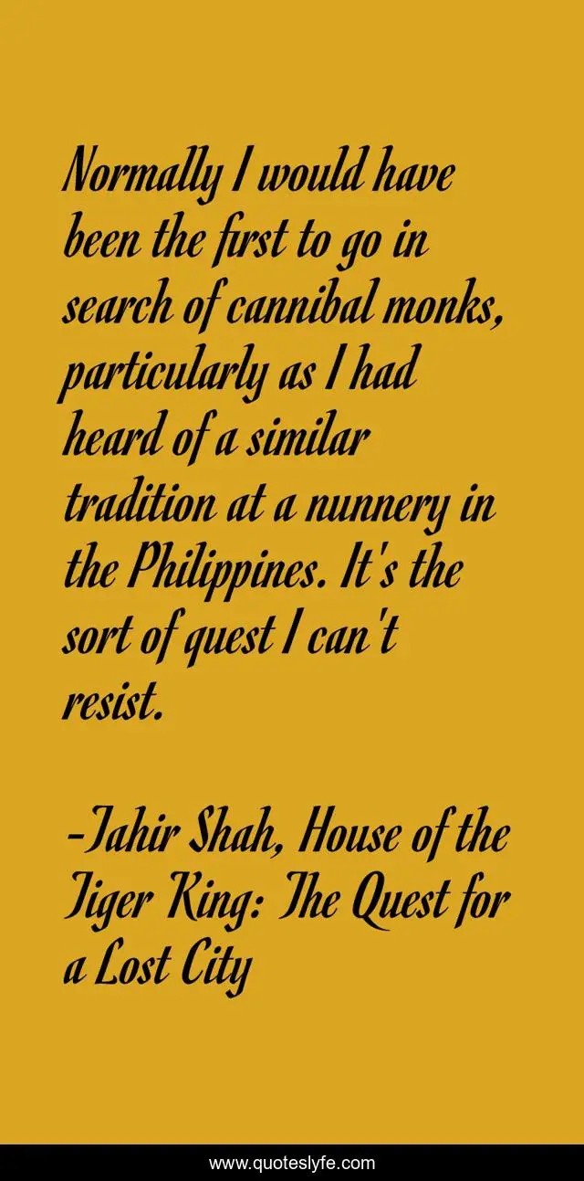 This page presents the quote "Normally I would have been the first to go in search of cannibal monks, particularly as I had heard of a similar tradition at a nunnery in the Philippines. It's the sort of quest I can't resist.". Author of this quote is Tahir Shah, House of the Tiger King: The Quest for a Lost City. This quote is about cannibalism, search, nunnery, monks, quest, adventure,.