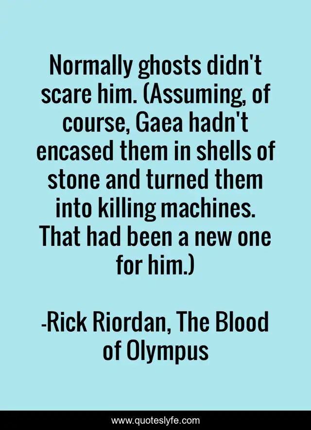 This page presents the quote "Normally ghosts didn't scare him. (Assuming, of course, Gaea hadn't encased them in shells of stone and turned them into killing machines. That had been a new one for him.)". Author of this quote is Rick Riordan, The Blood of Olympus. This quote is about funny, comedy, defeat-gaea, gaea, sarcasm,.
