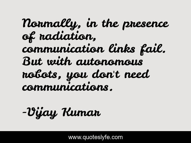 This page presents the quote "Normally, in the presence of radiation, communication links fail. But with autonomous robots, you don't need communications.". Author of this quote is Vijay Kumar. This quote is about fail, robots,.