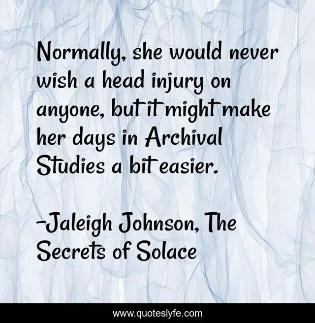 This page presents the quote "Normally, she would never wish a head injury on anyone, but it might make her days in Archival Studies a bit easier.". Author of this quote is Jaleigh Johnson, The Secrets of Solace. This quote is about funny, injury, school-story, middle-grade, science-fiction, fantasy, adventure, steampunk, comedy,.