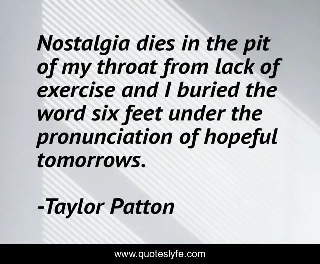 This page presents the quote "Nostalgia dies in the pit of my throat from lack of exercise and I buried the word six feet under the pronunciation of hopeful tomorrows.". Author of this quote is Taylor Patton. This quote is about poem, poetry, hopeful, nostalgia, nostalgic, poems, tomorrow,.
