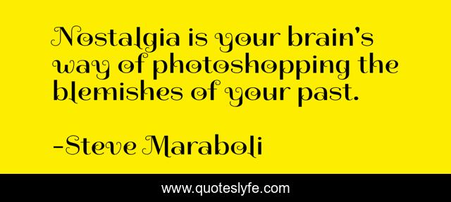 This page presents the quote "Nostalgia is your brain's way of photoshopping the blemishes of your past.". Author of this quote is Steve Maraboli. This quote is about blemish, memories, nostalgia, past, brain, present,.