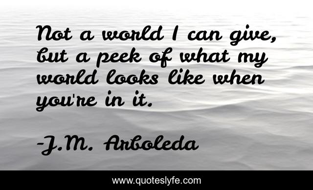 This page presents the quote "Not a world I can give, but a peek of what my world looks like when you're in it.". Author of this quote is J.M. Arboleda. This quote is about enthusiasm, hope, love, inspirational, affection,.