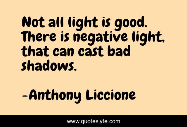 This page presents the quote "Not all light is good. There is negative light, that can cast bad shadows.". Author of this quote is Anthony Liccione. This quote is about deception, delusion, incorrect-reasoning, misunderstanding, devil-as-an-angel-of-light, people-s-perceptions, misapprehension, judging, misconceptions,.