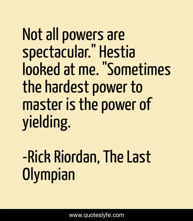 This page presents the quote "Not all powers are spectacular." Hestia looked at me. "Sometimes the hardest power to master is the power of yielding.". Author of this quote is Rick Riordan, The Last Olympian. This quote is about hestia, percy-jackson,.