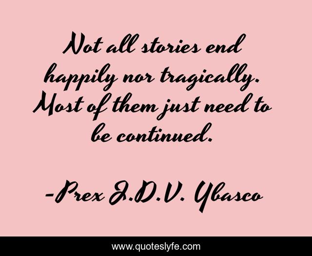 This page presents the quote "Not all stories end happily nor tragically. Most of them just need to be continued.". Author of this quote is Prex J.D.V. Ybasco. This quote is about literature, young-adult,.