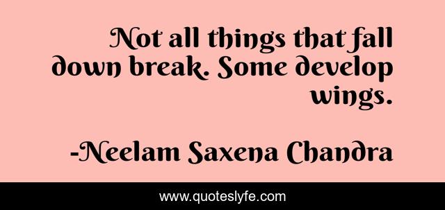 This page presents the quote "Not all things that fall down break. Some develop wings.". Author of this quote is Neelam Saxena Chandra. This quote is about motivation, neelam-saxena-chandra, neelam-chandra, motivational, neelam-saxena, confidence, inspirational-attitude, optimistic, inspirational,.