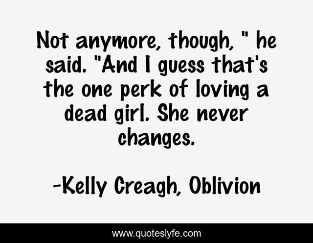 This page presents the quote "Not anymore, though, " he said. "And I guess that's the one perk of loving a dead girl. She never changes.". Author of this quote is Kelly Creagh, Oblivion. This quote is about death, love, oblivion, change, nevermore, kelly-creagh, affection,.