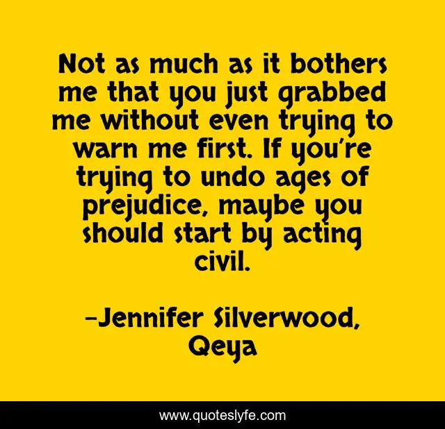 This page presents the quote "Not as much as it bothers me that you just grabbed me without even trying to warn me first. If you’re trying to undo ages of prejudice, maybe you should start by acting civil.". Author of this quote is Jennifer Silverwood, Qeya. This quote is about fantasy, ya-novella, qeya, sci-fi,.