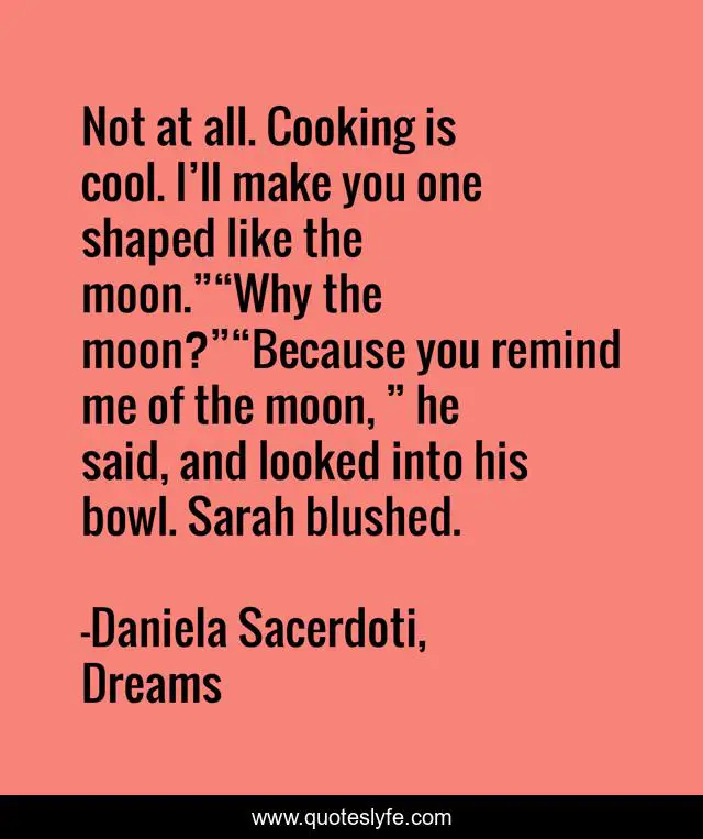 This page presents the quote "Not at all. Cooking is cool. I’ll make you one shaped like the moon.”“Why the moon?”“Because you remind me of the moon, ” he said, and looked into his bowl. Sarah blushed.". Author of this quote is Daniela Sacerdoti, Dreams. This quote is about daniela-sacerdoti, moom, dreams,.