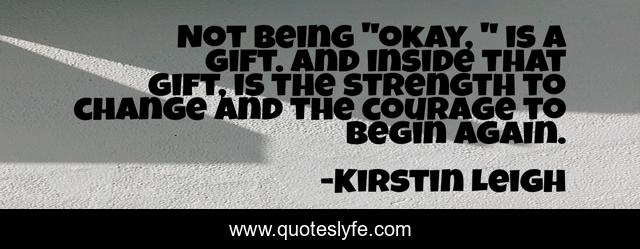 This page presents the quote "Not being "okay, " is a gift. And inside that gift, is the strength to change and the courage to begin again.". Author of this quote is Kirstin Leigh. This quote is about destiny, breakthrough, life-lessons, life-changing, life-philosophy, life-and-living,.
