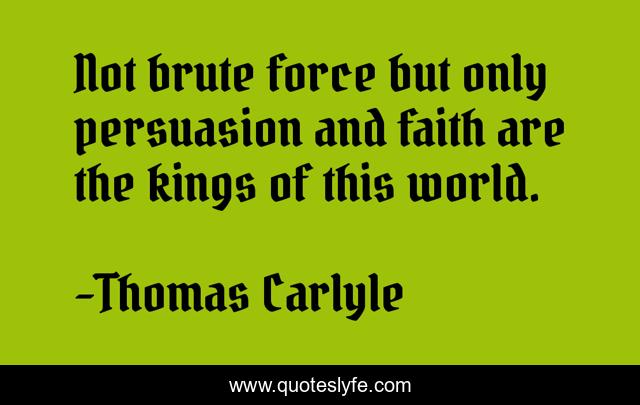 This page presents the quote "Not brute force but only persuasion and faith are the kings of this world.". Author of this quote is Thomas Carlyle. This quote is about world, persuasion, kings,.