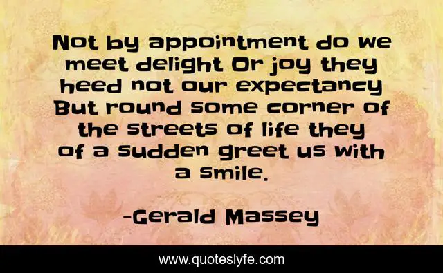 This page presents the quote "Not by appointment do we meet delight Or joy they heed not our expectancy But round some corner of the streets of life they of a sudden greet us with a smile.". Author of this quote is Gerald Massey. This quote is about joy, life, streets,.