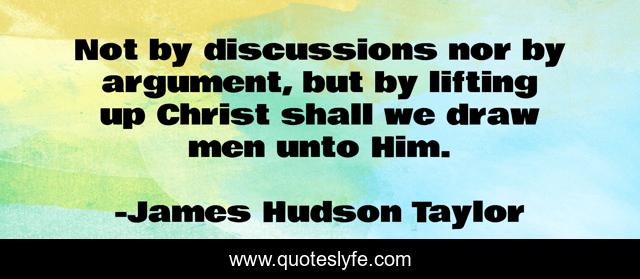 This page presents the quote "Not by discussions nor by argument, but by lifting up Christ shall we draw men unto Him.". Author of this quote is James Hudson Taylor. This quote is about christianity, understanding, christ, thoughts-for-the-quiet-hour,.