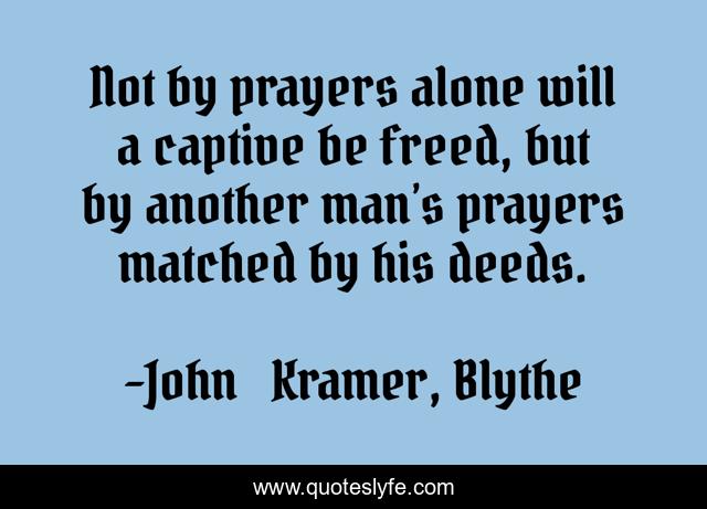 This page presents the quote "Not by prayers alone will a captive be freed, but by another man’s prayers matched by his deeds.". Author of this quote is John Kramer, Blythe. This quote is about freedom, deeds, captive, free-the-people, prayer, praying,.