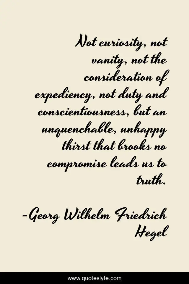 This page presents the quote "Not curiosity, not vanity, not the consideration of expediency, not duty and conscientiousness, but an unquenchable, unhappy thirst that brooks no compromise leads us to truth.". Author of this quote is Georg Wilhelm Friedrich Hegel. This quote is about duty, conscientiousness, hegel, curiosity, truth, vanity,.